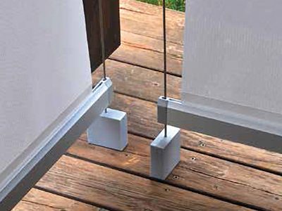 Tenda a caduta che presenta di serie cassonetto da 120 cm, guide laterali da 75 cm e barra maniglia inferiore da 80 cm.
