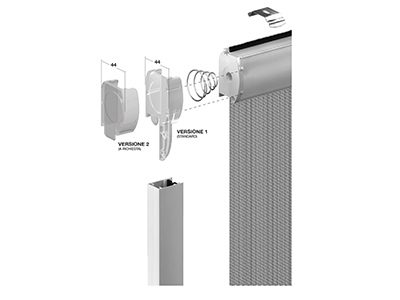 Zanzariera ad avvolgimento a molla e scorrimento verticale, con spazzolino antivento di serie, cassonetto arrotondato di 40 mm.