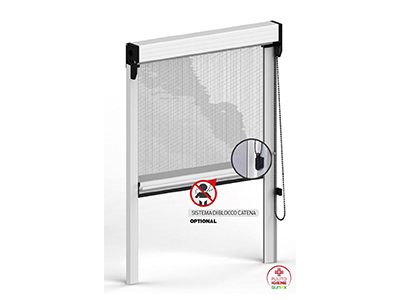 Zanzariera a molla con cassonetto da 50 mm a scorrimento verticale, azionata tramite comando a catena.